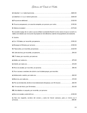 III. Área de campamento, sin casa de campaña, por persona, por noche…………………………..$150.00