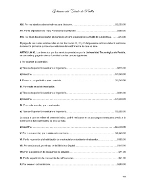 ARTÍCULO 95. Los derechos por los servicios prestados por la Universidad Tecnológica de Puebla,